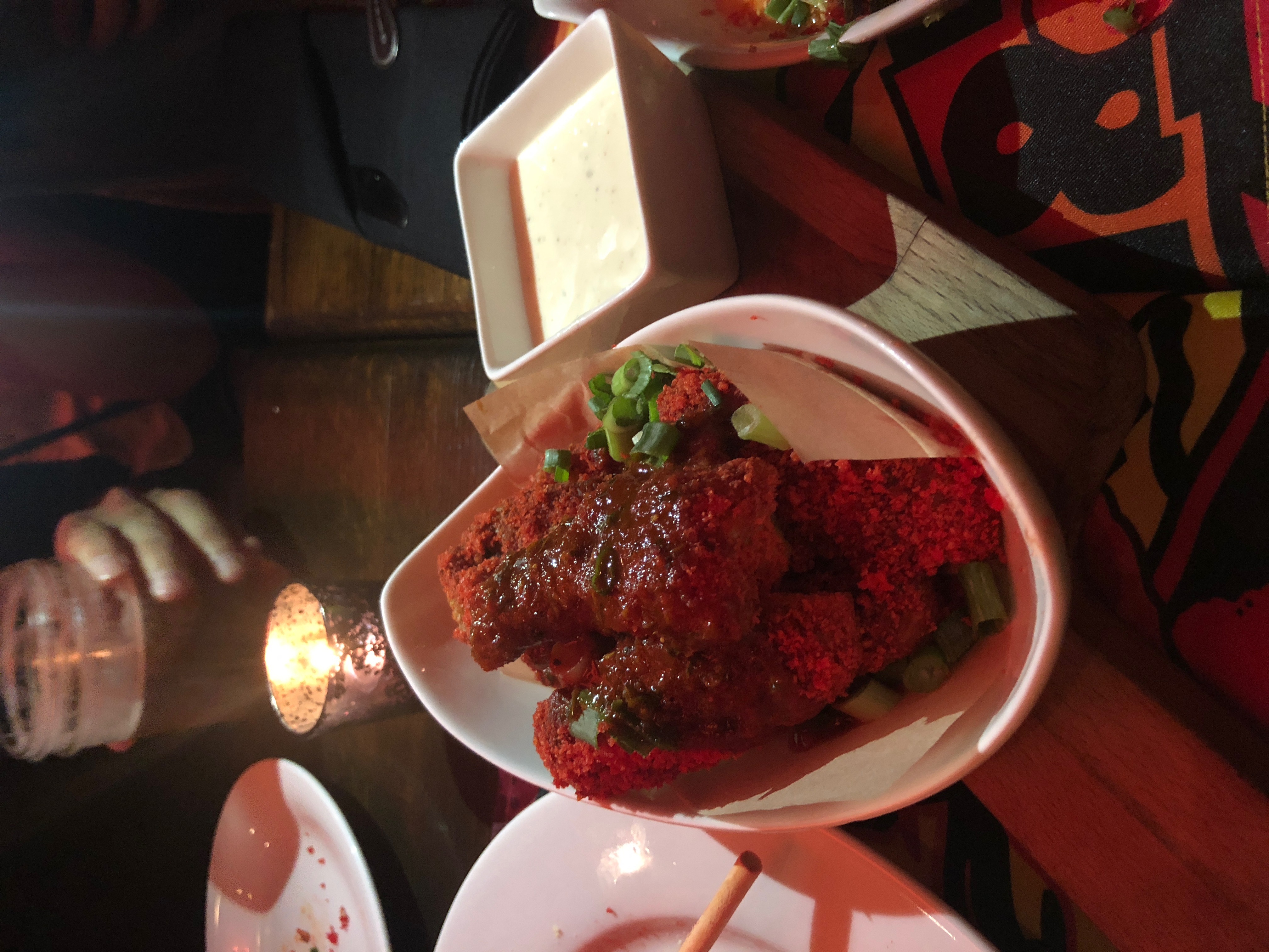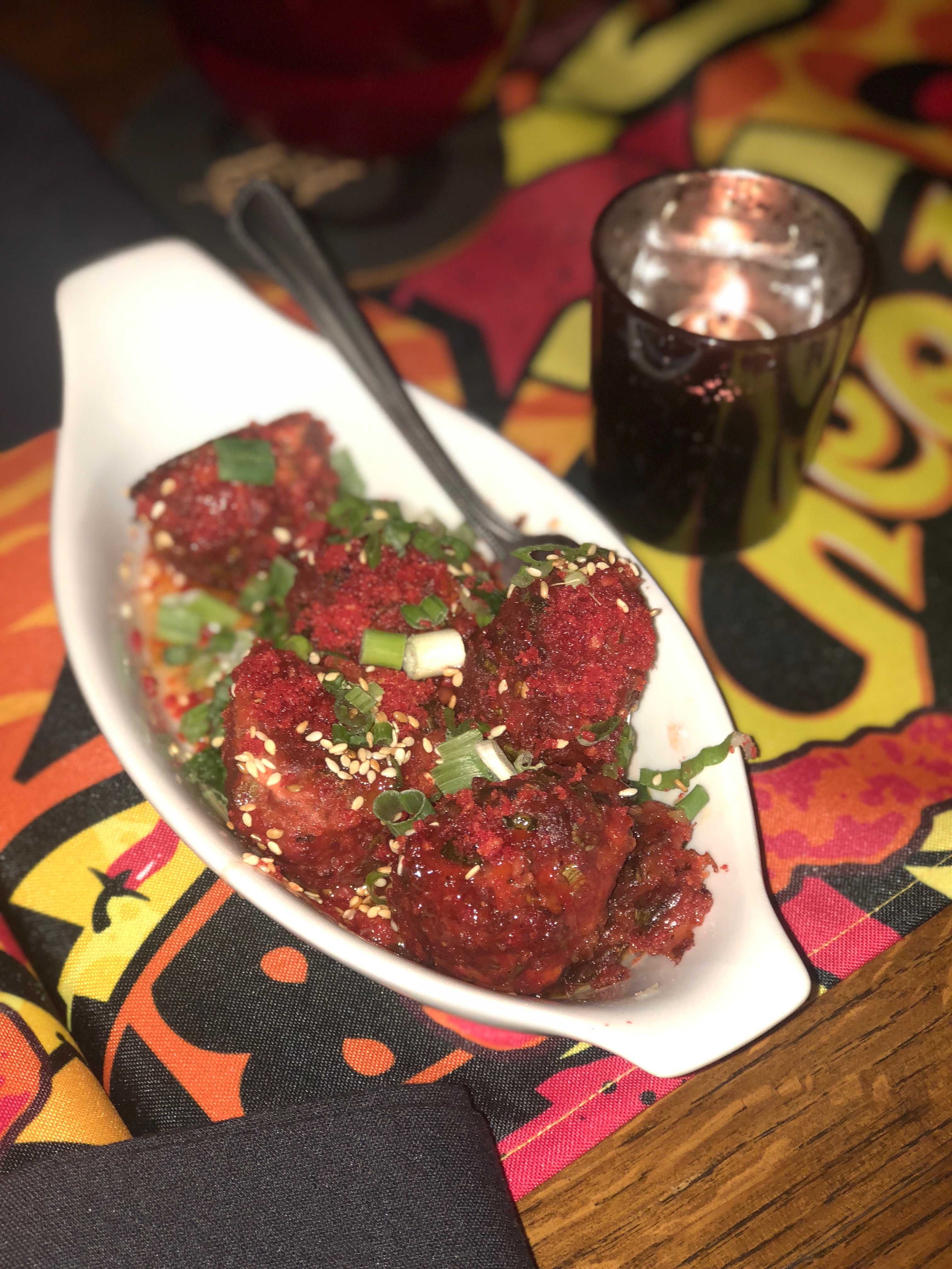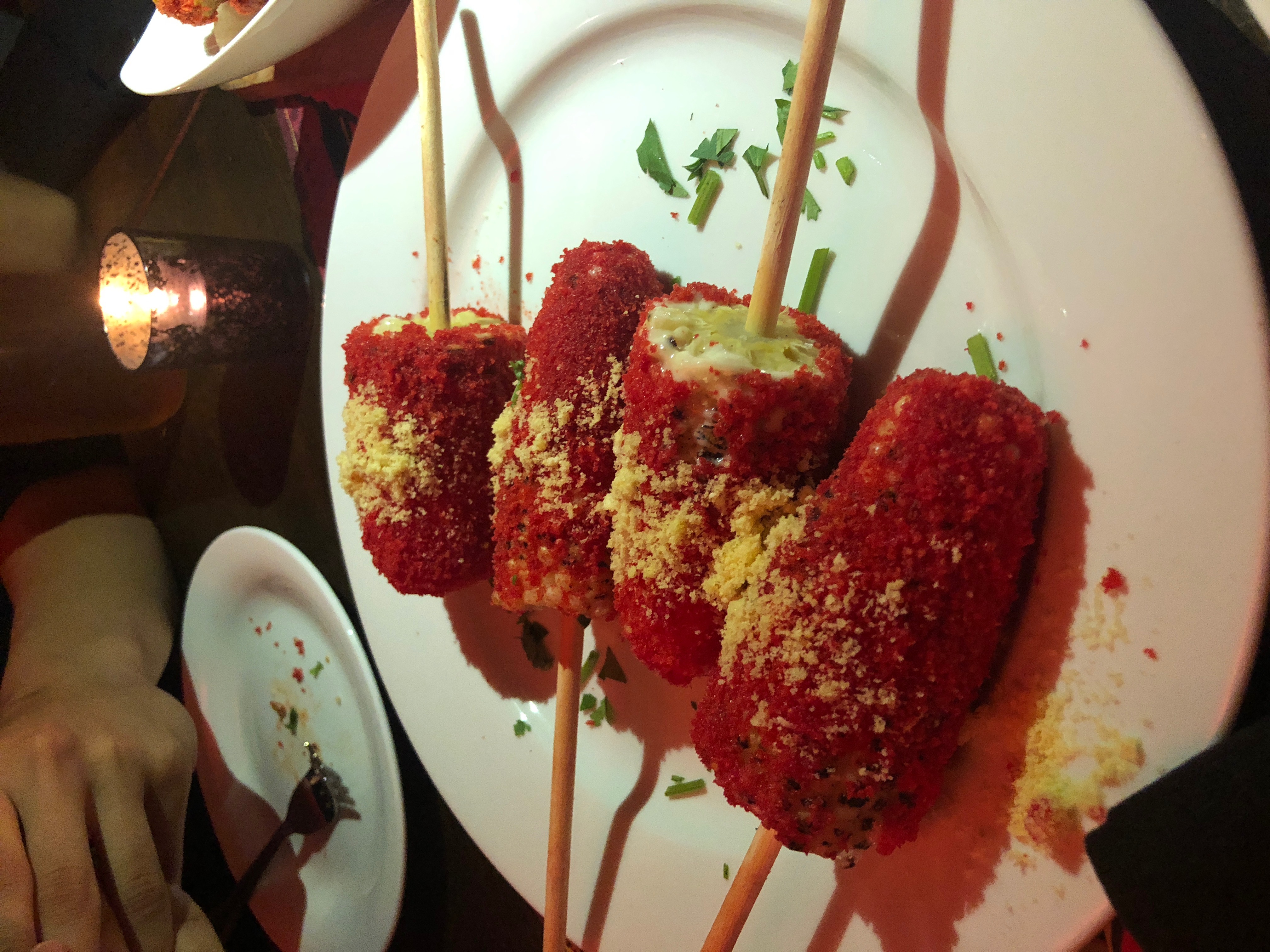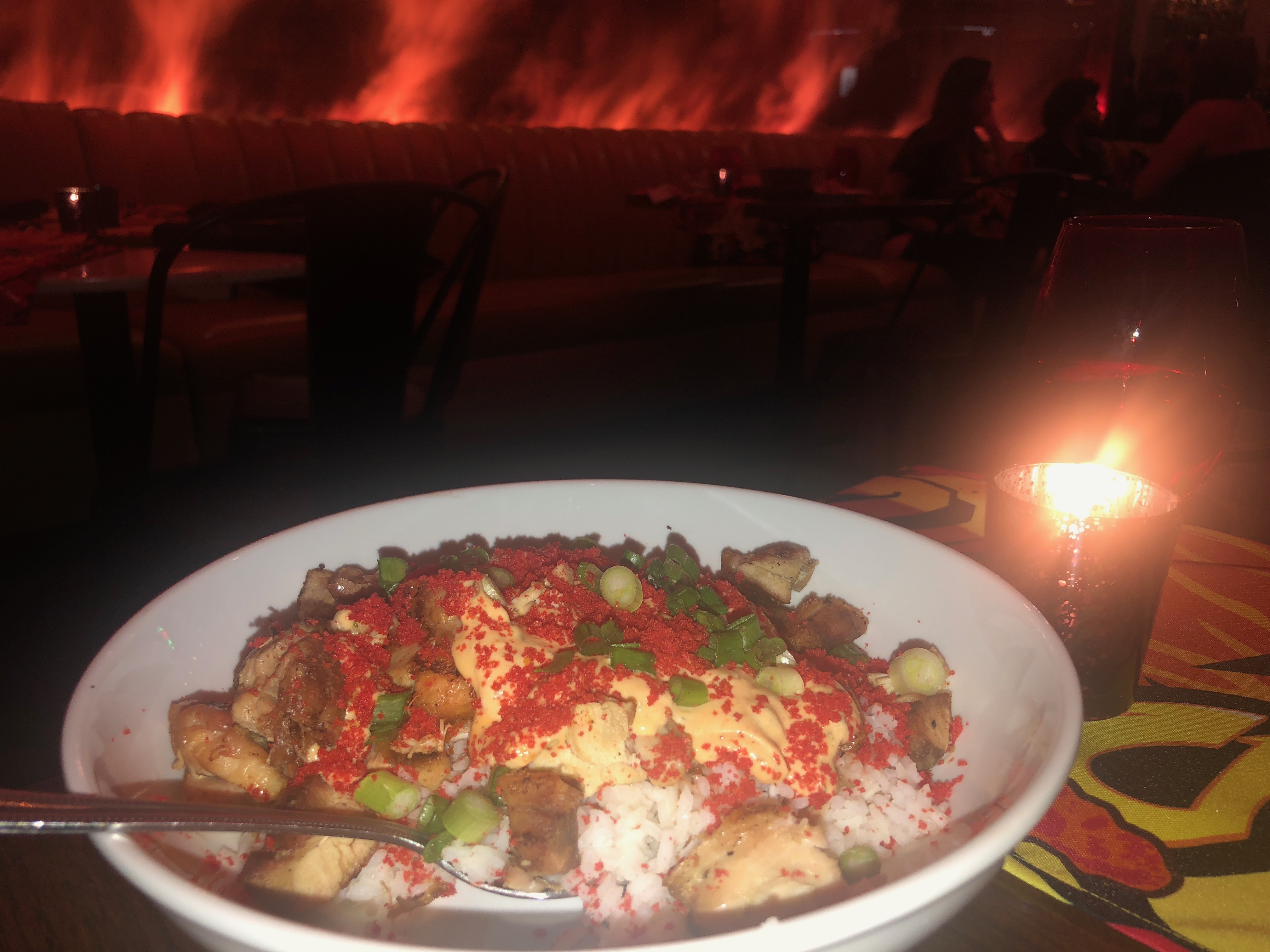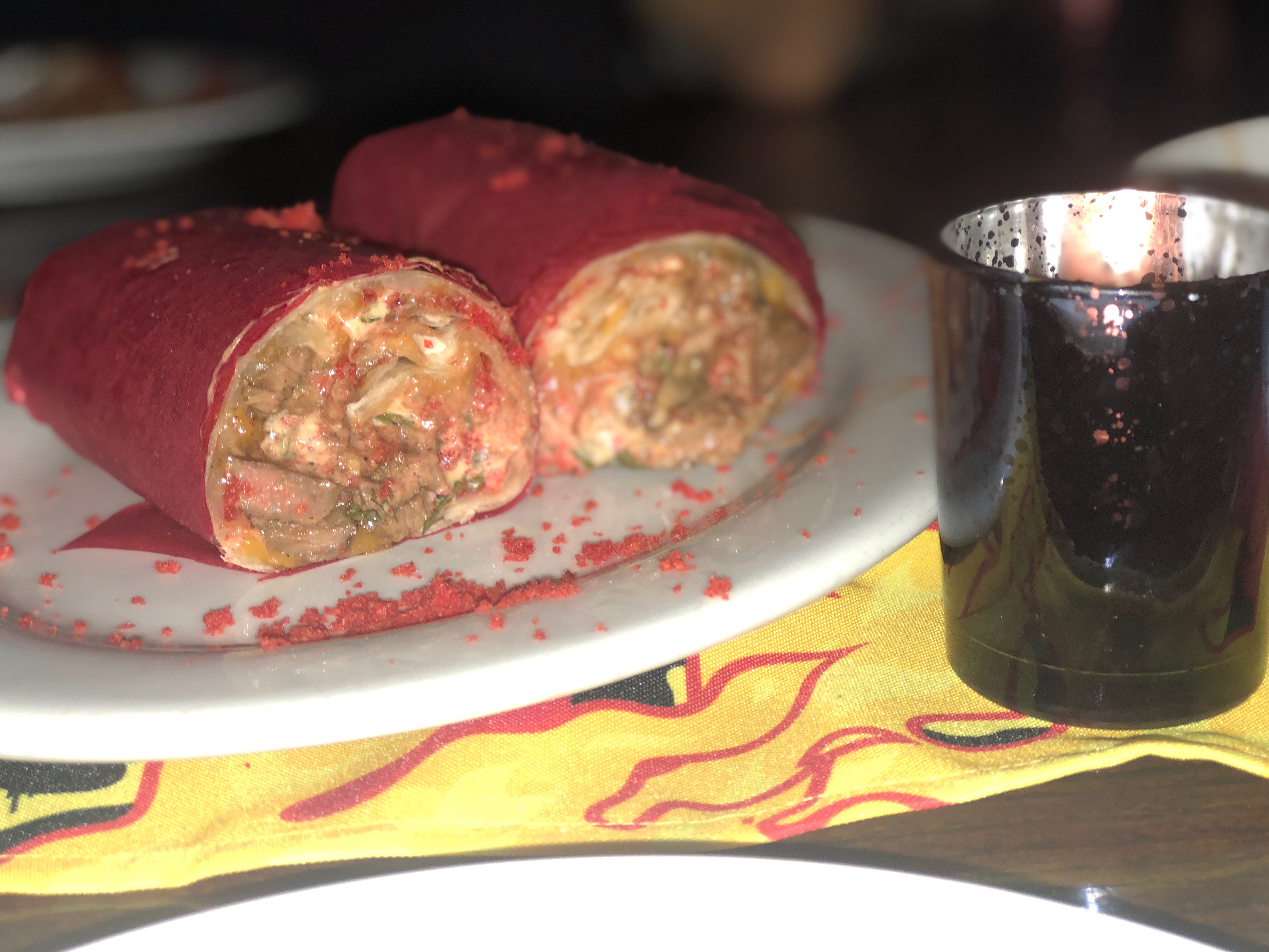 The Flamin’ Hot Spot was actually just a redesigned concept of the Madera Kitchen on Cahuenga Blvd. As we entered, we were greeted by a security guard wearing shades very similar to that of Chester Cheetos’. Behind him was a long line of people who I assumed were walk-ins. The restaurant was dimly lit with random pops of red, orange, and yellow on neon signs and hot cheeto themed wall decor. As we waited for our table, we decided to explore the space. There were two areas for photo ops in the front patio. One giant Flamin’ Hot neon sign with some sequined hot cheeto pillows, and a giant hot cheeto animation wall where you could take AR videos with a kaleidoscope of hot cheetos as your backdrop. In the back outdoor patio was a bar where you could get “hot & spicy” cocktails. All dining tables were candle lit with red glass cups and hot cheeto themed table runners.