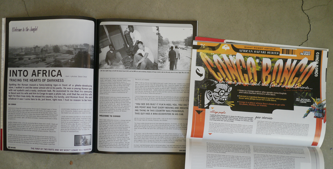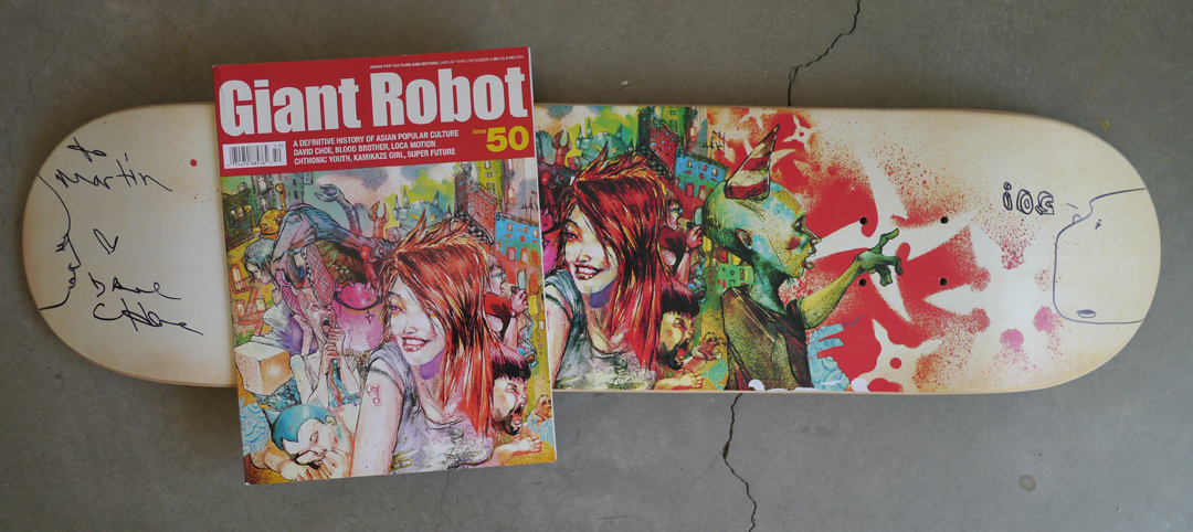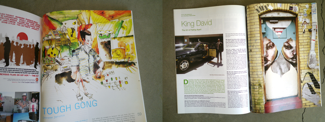 In time, Choe became Giant Robot’s go-to guy for providing art for articles that didn’t have decent photographs. He was super fast and ridiculously versatile. Despite the fact that it doesn’t have big butts or bodily fluids, my favorite editorial piece of all time by him is the intro image for my series of interviews on Chinese Jamaican producers: Clive Chin, Herman Chin-Loy, Leonard “Santic” Chin, and Jo Jo Hookim. The crew at Pressure Sounds provided incredible vintage photos for the spreads but Dave’s colorful illustration added incredible funk and energy. Amazingly, we didn’t actually run an interview with Dave (or give him the cover) until issue 50. By then, he was being managed by the same guy who handled Banksy and had moved on to gambling as his main interest.