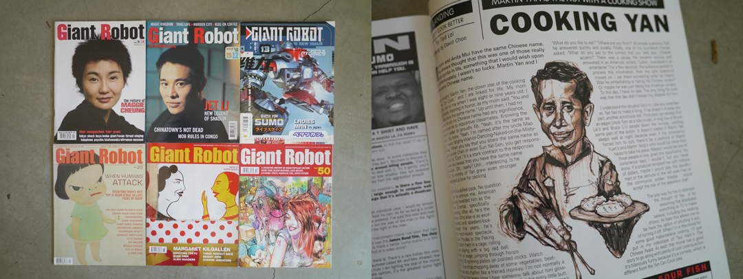 Of course, David Choe’s upcoming talk at the Center for the Preservation of Democracy reminds me of when I edited Giant Robot mag and he was a contributor. The first time I met him was at the San Diego Comic-Con in 1997. I don’t recall if he was a student or recent dropout of CCAC, but he came to our table in the small press area and said that he wanted to contribute to the magazine. Co-founder Eric Nakamura was roaming around the floor, so I told Dave that there was an article about Martin Yan that required an image. I didn’t really expect one to show up but, lo and behold, Dave’s painting of the buck-toothed celebrity chef arrived soon afterward and it was perfect.
