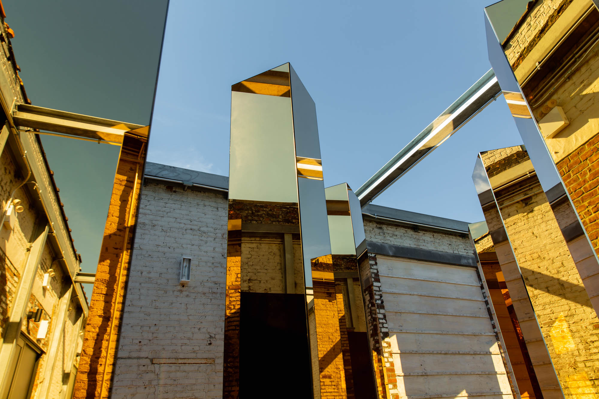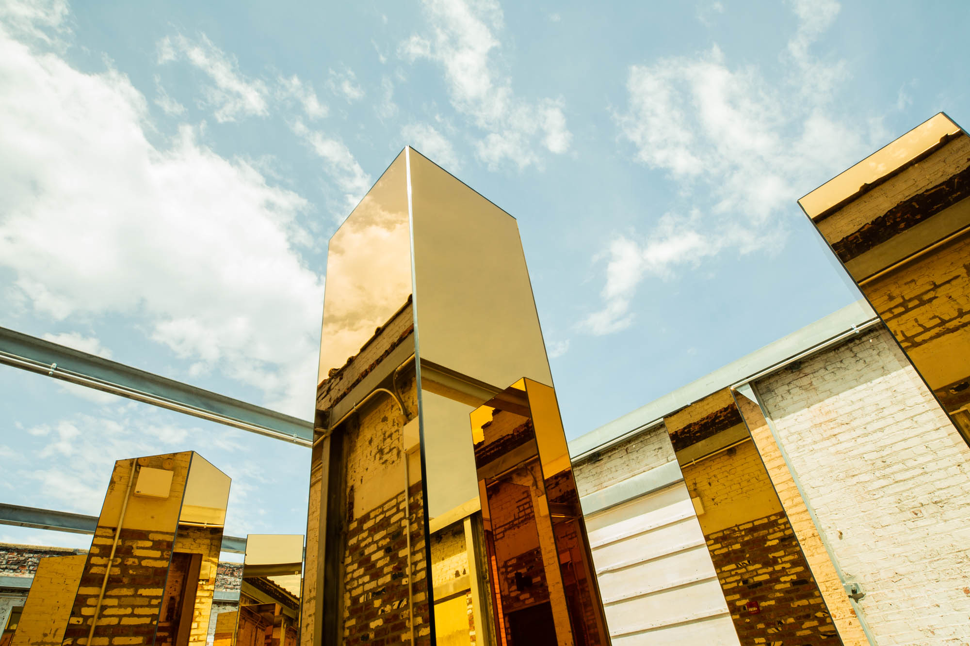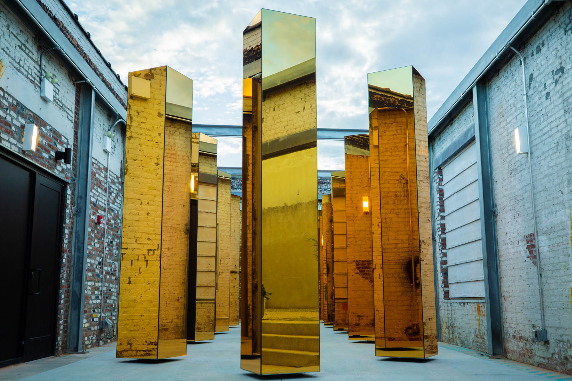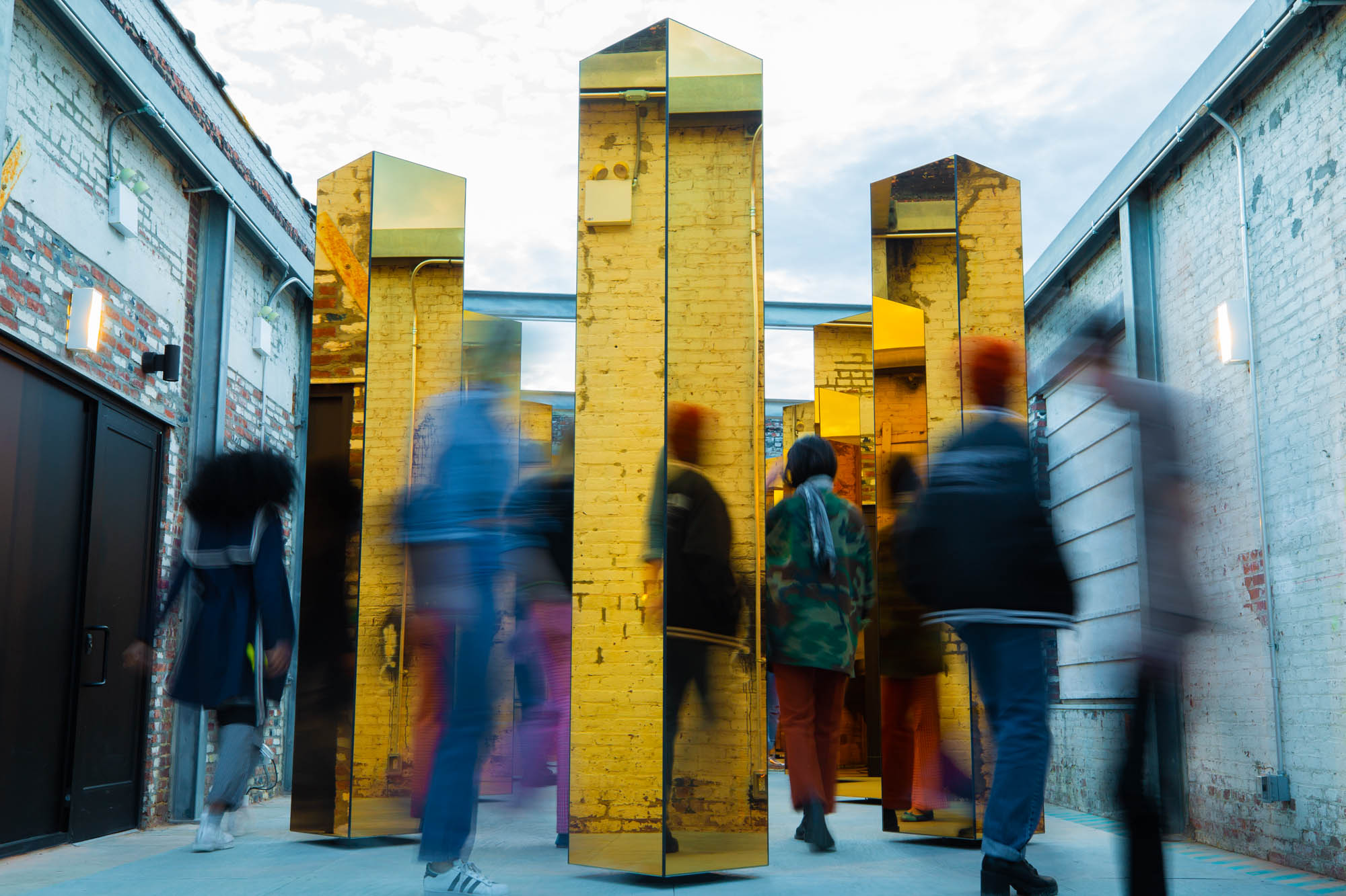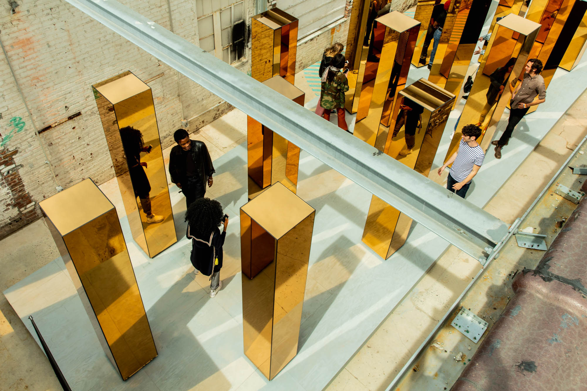 The gold-mirrored towers sit nine feet high that rotate, displaying a change in reflections and direction of light mimicking the pace of New York City; based on real-time data such as traffic and energy consumption. Visitors are encouraged to walk through the exhibit that UVA designer Maximo Recio compares to “exploring and trekking through Manhattan’s glass skyscrapers.”